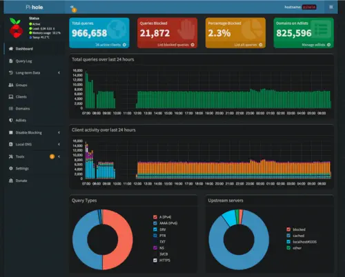 When browsing the Pi-Hole website you will see that it is primarily advertised as an ad-blocking tool. Pi-Hole is actually a DNS server that blocks ads by maintaining a list of domains that it will refuse to resolve. It does this quite well and I do use the ad-blocking capability heavily and with great success on my home network. On an average day, the device responds to around 1 million queries per day with plenty of room to grow: